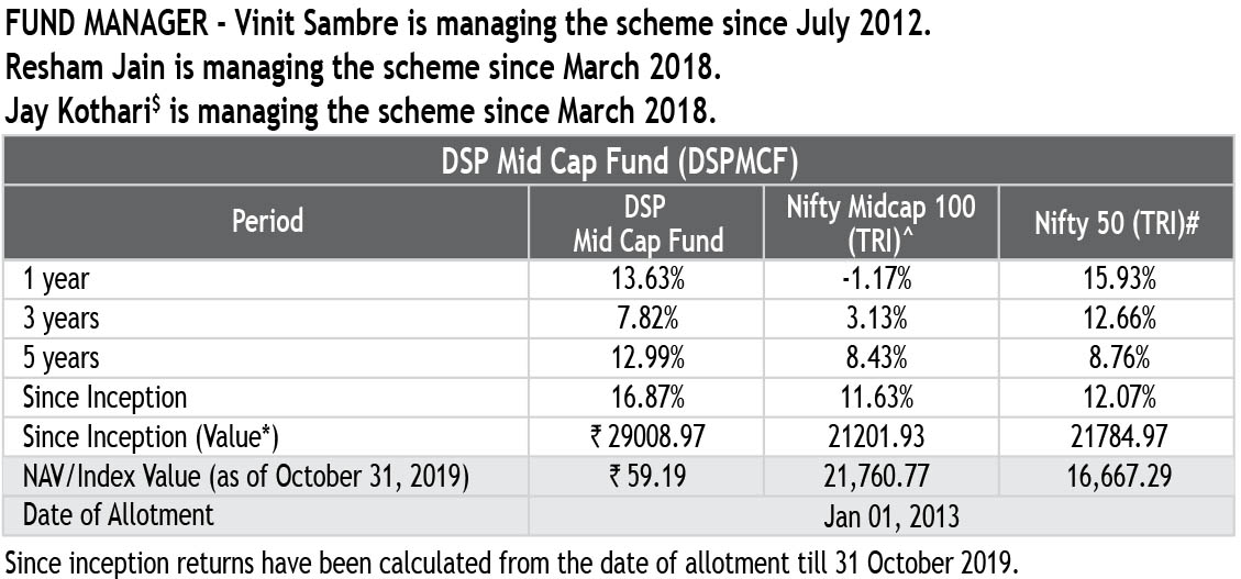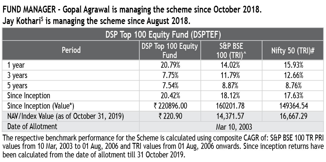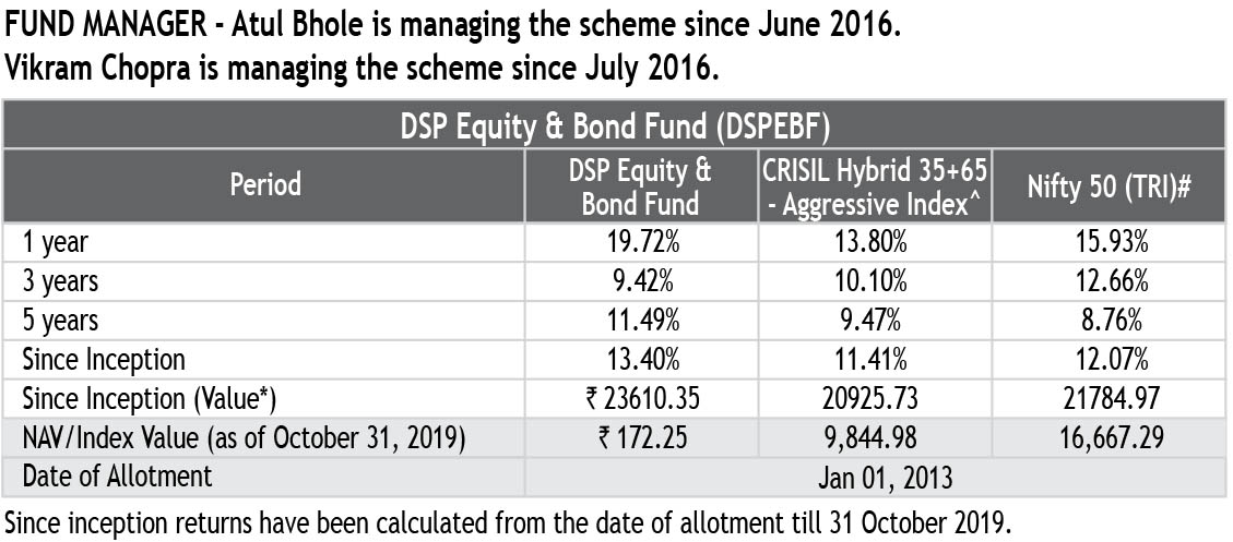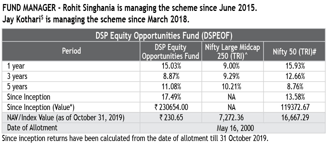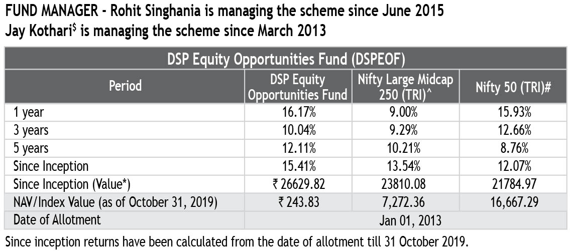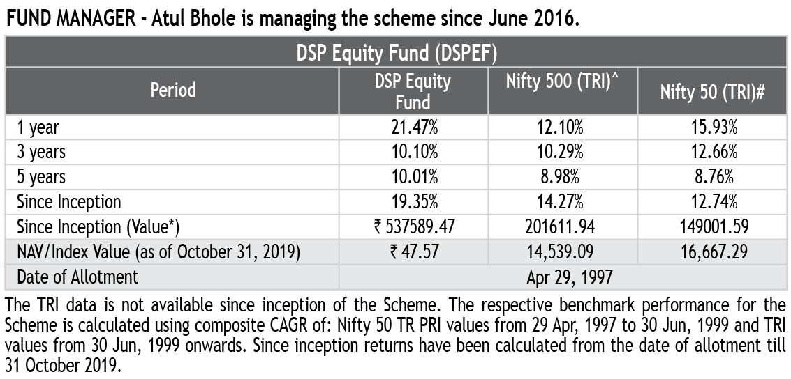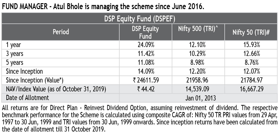 (b) ^Scheme Benchmark. #Standard Benchmark. *Based on investment of ₹ 10,000 made at inception. All data for Regular plan Growth option; Regular plan Dividend option for DSP Equity Fund, assuming reinvestment of dividend. Different plans shall have a different expense structure.